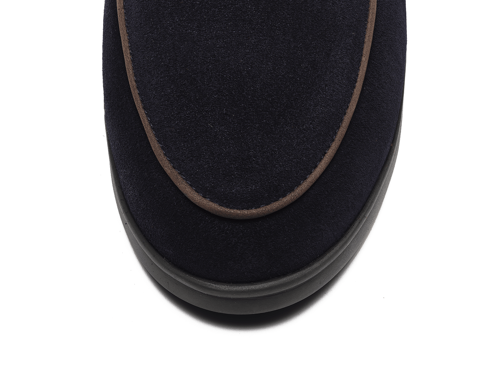 The Stride in Midnight Navy Suede captures understated elegance with seasonal comfort. Its velvety suede surface contrasts beautifully with the natural warmth of shearling, creating a refined cocoon for cooler days. Lightweight yet resilient, the rubber sole ensures grip and ease, making it a versatile companion from city mornings to relaxed evenings.